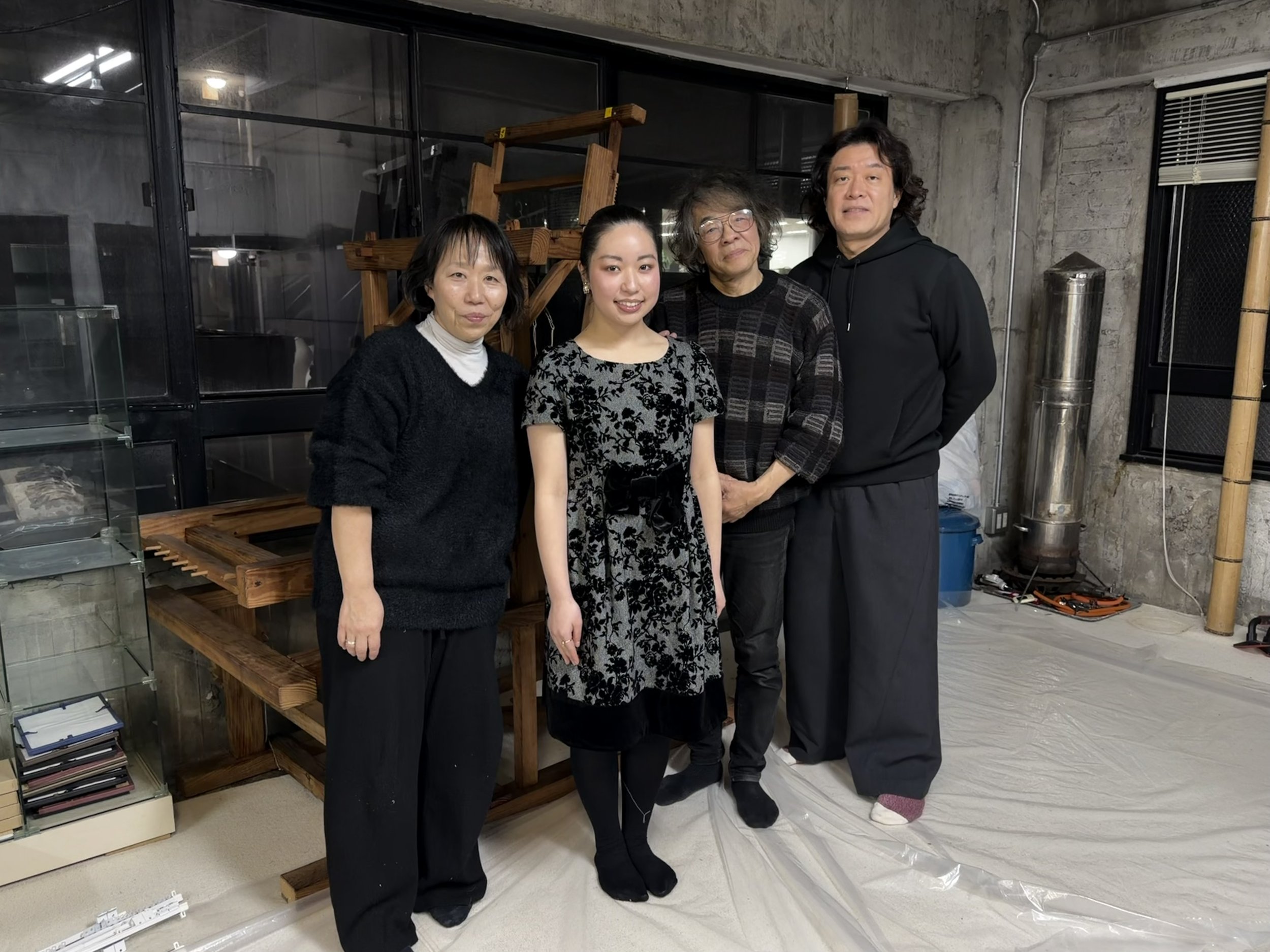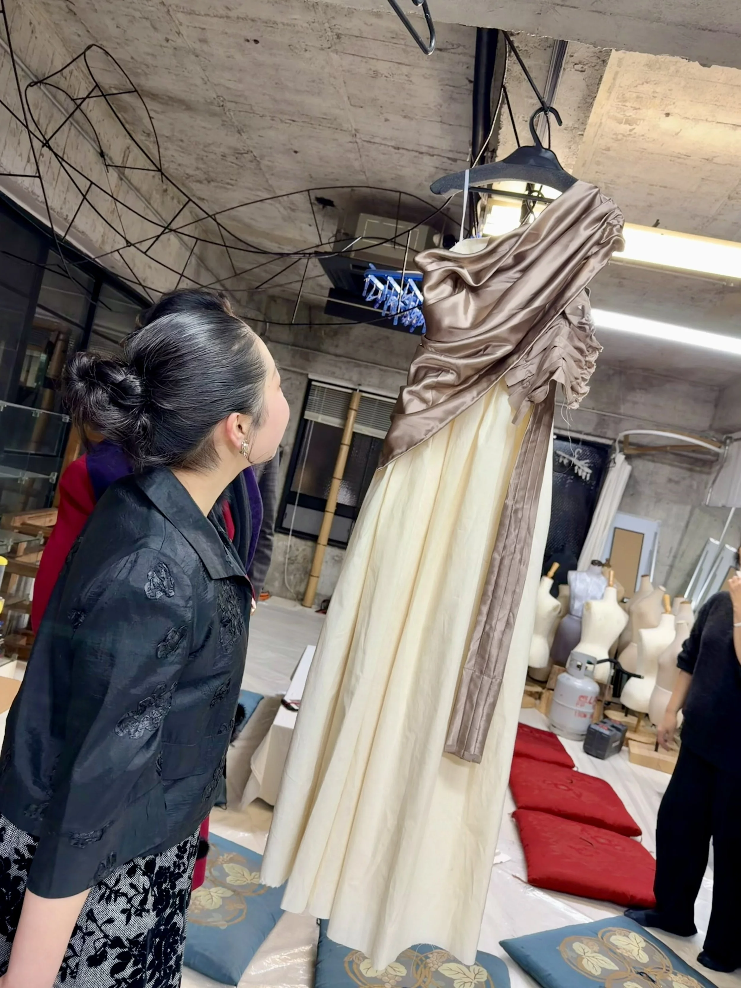 左から:二種類の仮縫いされたドレス、ドレスを見る私、素晴らしい製作チーム、パタンナーの宇野瑞代さん、染色家の成瀬優さん、デザイナーの䯨克也さん。